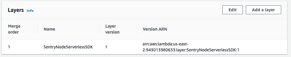 • The layer for Sentry is added to your Lambdas. Any existing layers are honored and the Sentry layer is appended to the end.
